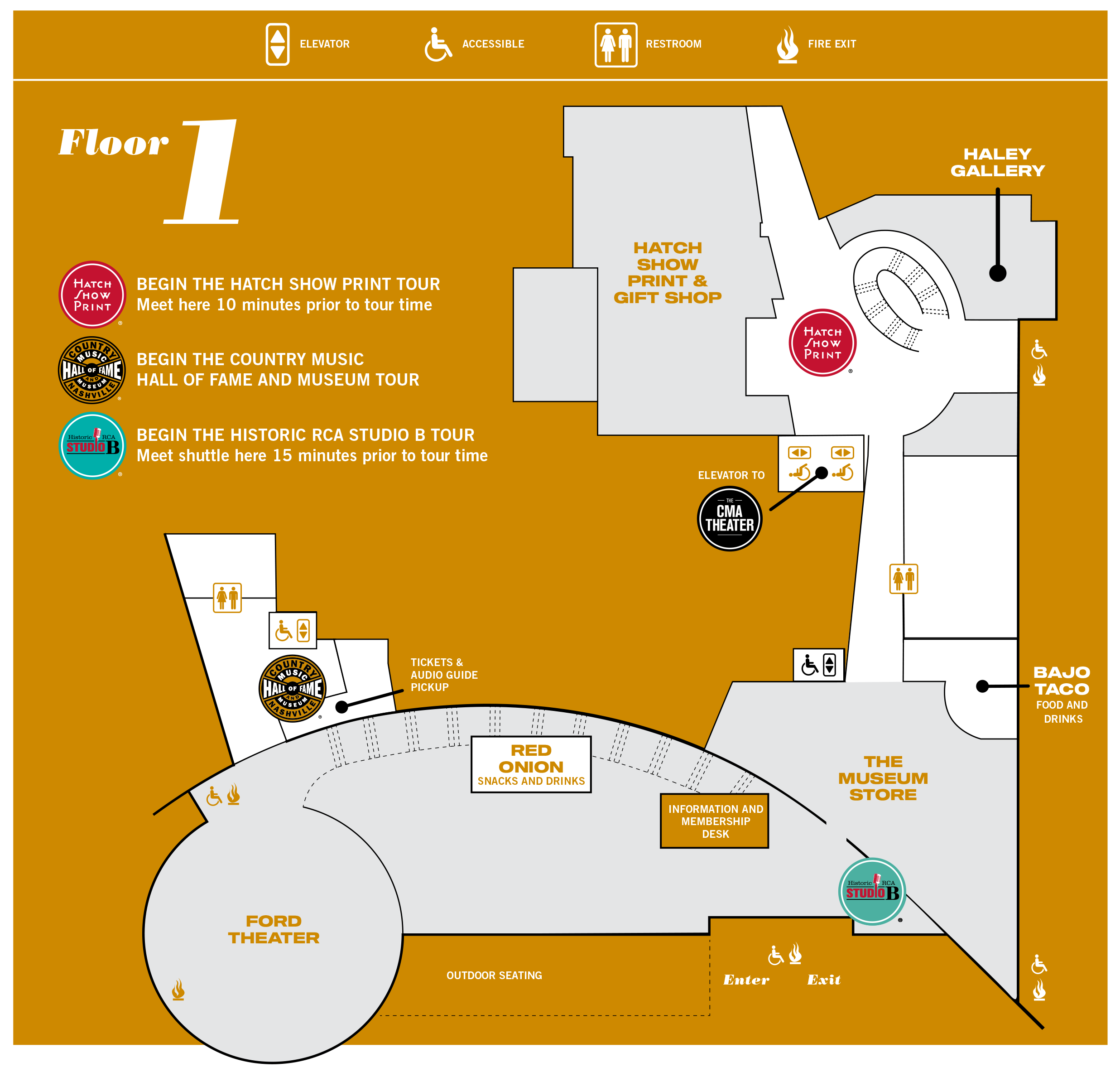Wheelchair-accessible and family/companion restrooms are available on all floors of the Museum and CMA Theater. Accessible water fountains are also available on each floor of the Museum and the fourth floor of the CMA Theater.