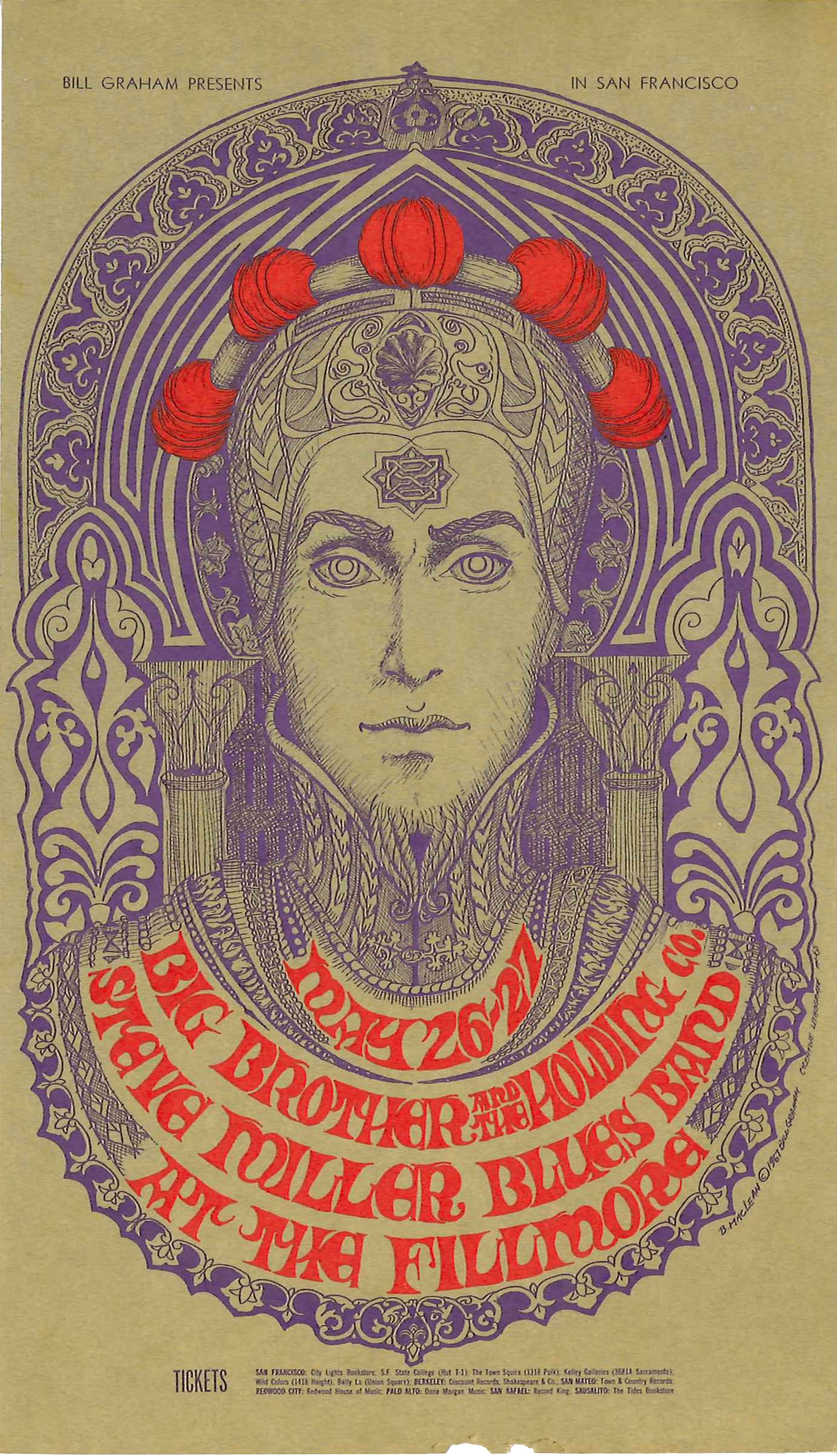 May 1967 poster for Big Brother and the Holding Company and the Steve Miller Blues Band at San Francisco's Fillmore Auditorium. Courtesy of Ron Cornelius