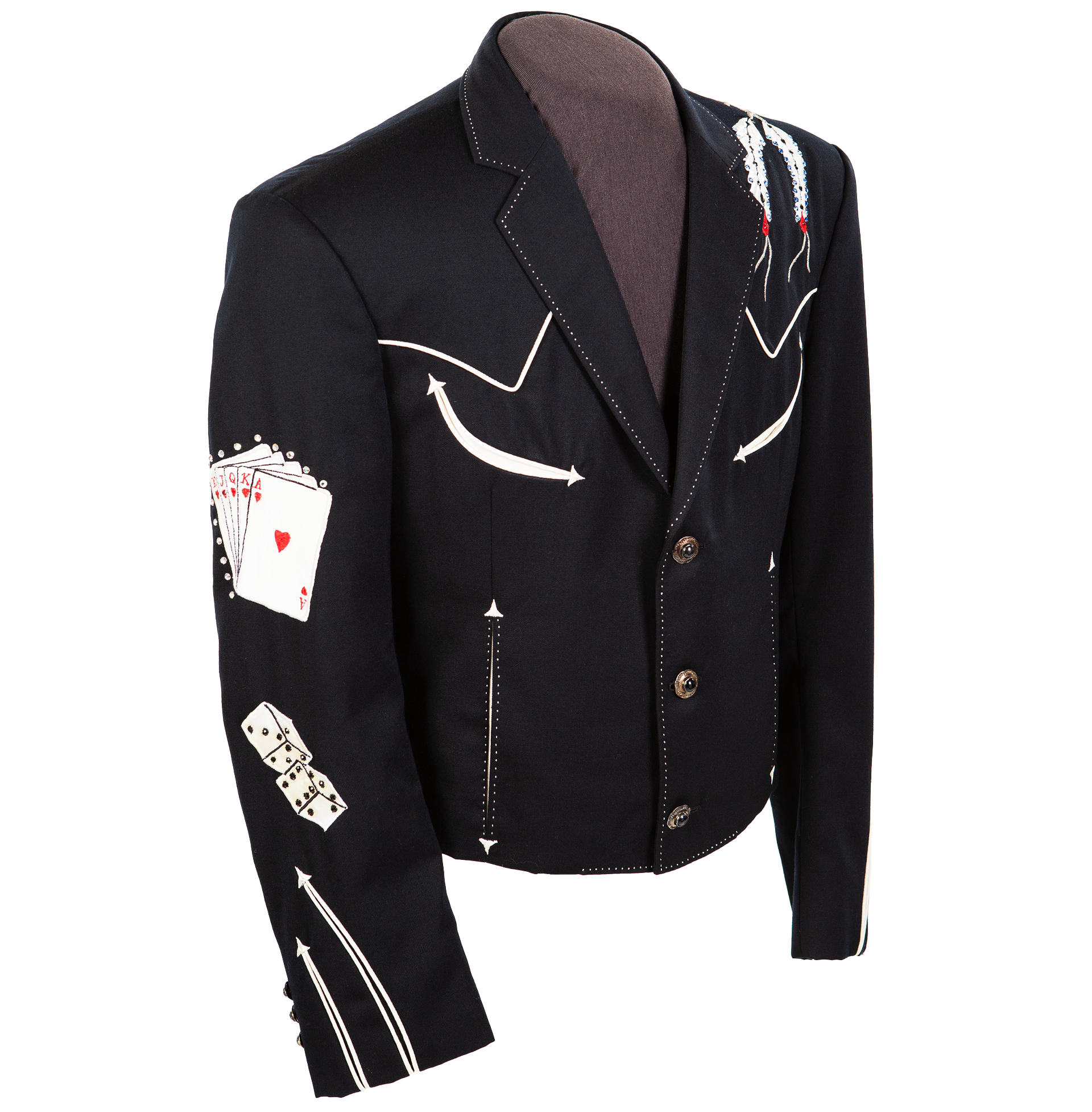 Dwight Yoakam wore this Manuel bolero jacket—embellished with rhinestones; contrasting piping; and embroidered dice, feathers, and playing cards showing a royal flush—in the music videos for his 1986 hits “Guitars, Cadillacs” and “Honky Tonk Man.” Courtesy of Dwight Yoakam