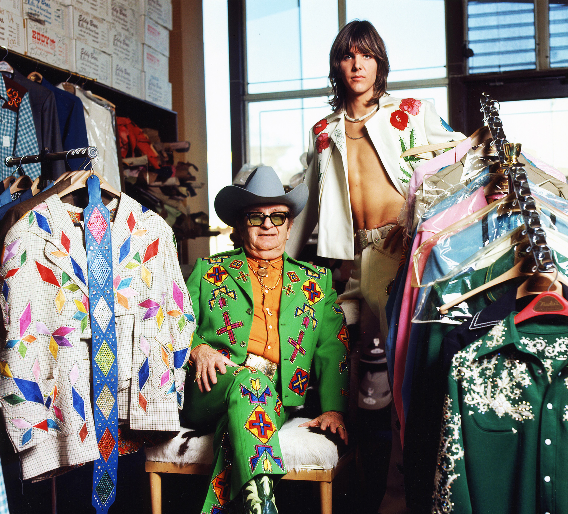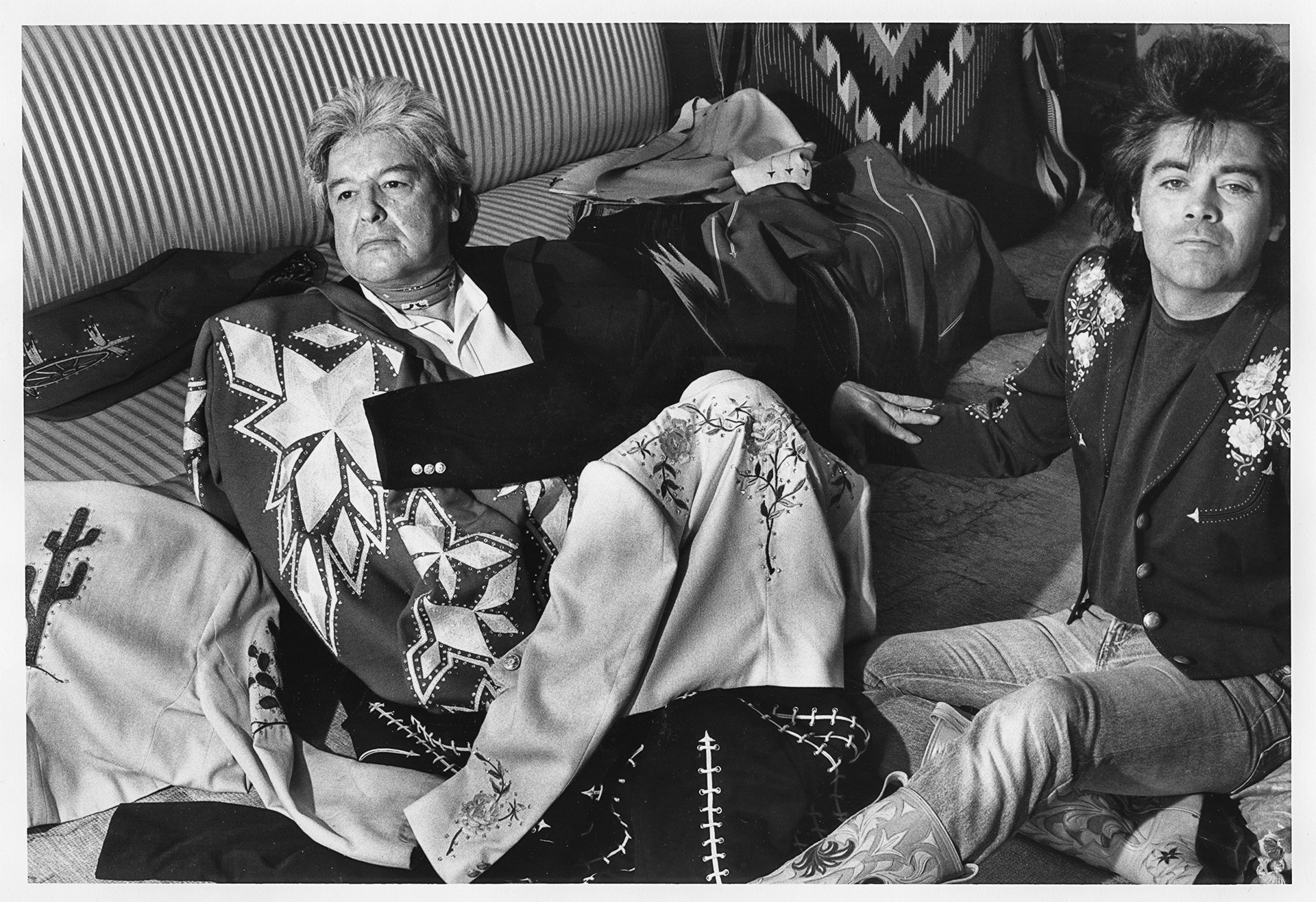 Connoisseurs of classic country music and the bold, Western-tailored outfits worn by artists who created those sounds, Dwight Yoakam and Marty Stuart emerged in the 1980s with fresh approaches to updating their beloved musical traditions. Each of them collaborated with Manuel to design retro-styled stage wear that proudly and loudly telegraphed their appreciation for country’s past, while expressing their individuality.