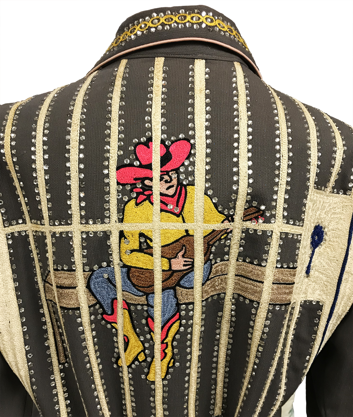 Playing off Porter Wagoner’s name, Nudie’s Rodeo Tailors designed a multitude of wagon-themed suits for the lanky singer and popular TV show host, including this bolero jacket and trousers festooned with rhinestones and embroidered wagon wheels, stagecoaches, and desert scenes. Courtesy of Debra Jean Loy