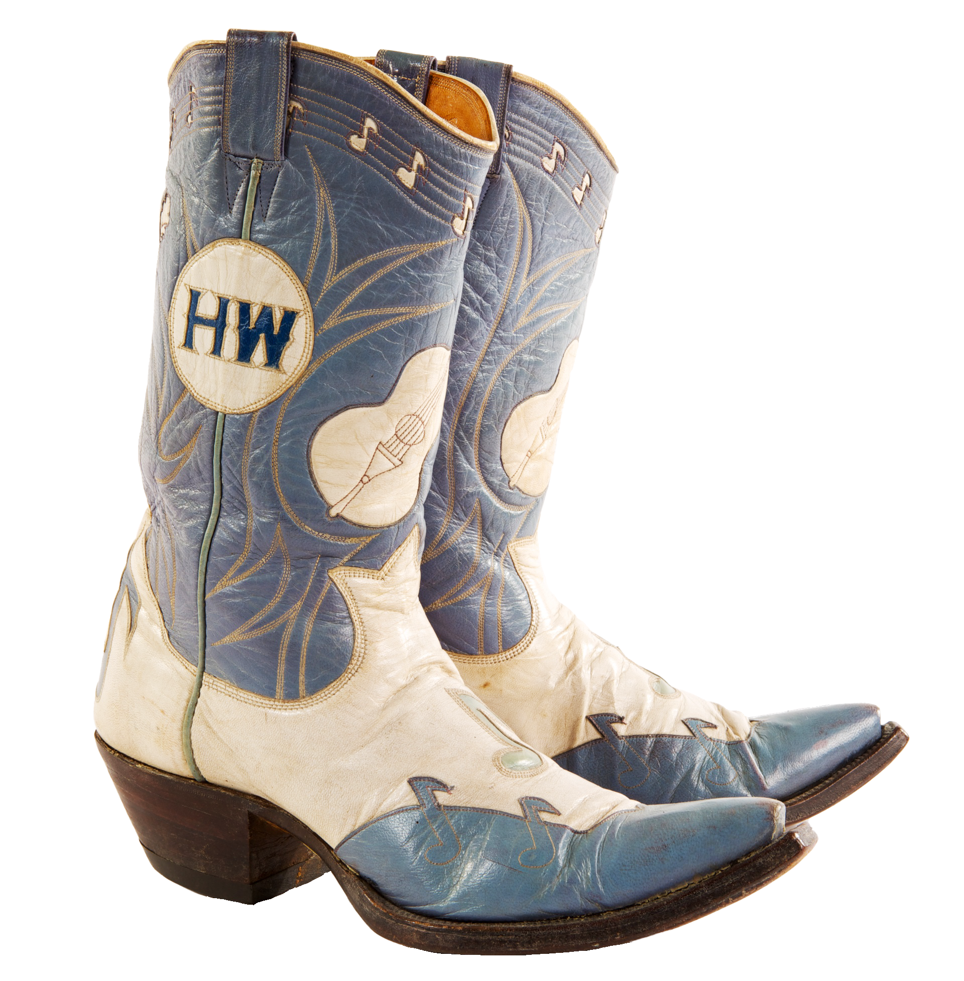 Nudie’s Rodeo Tailors designed Hank Williams’s most famous suit, embellished with appliqués of musical notes and a guitar, and these hand-tooled boots with his initials on the shafts. A hand-painted Ben Pulitzer silk tie and Red Myrick shirt completed the ensemble. Courtesy of Hank Williams Jr.