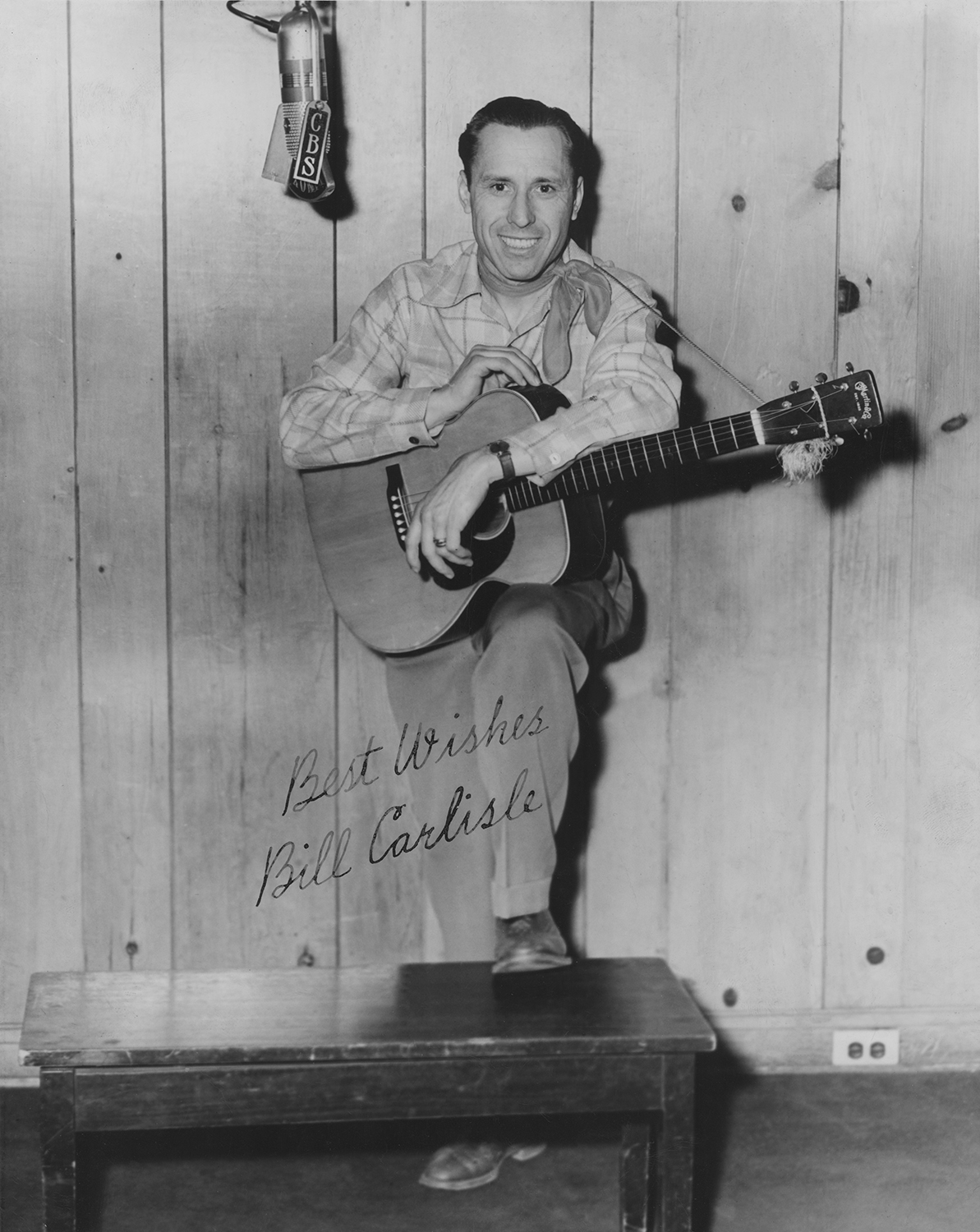 Autographed length photograph of Bill Carlisle holding a guitar by a CBS microphone.