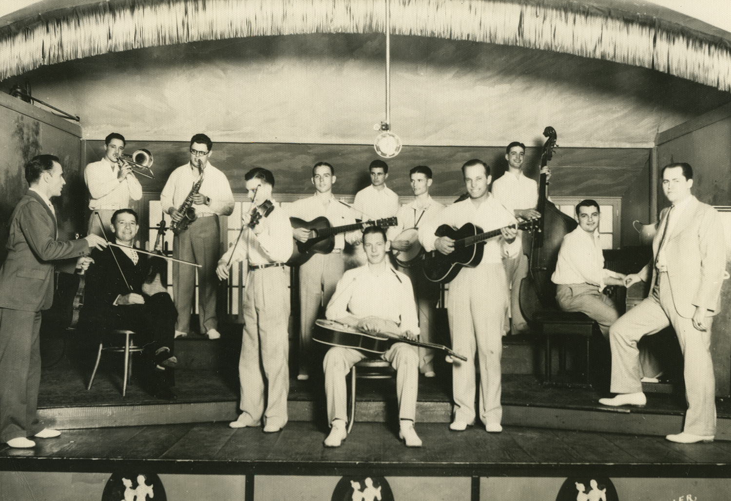 Publicity photo of Bob Wills (fourth from left) & His Texas Playboys posing onstage with their instruments, 1937. Photo by Walter T.J. Madison, Tulsa, Oklahoma.