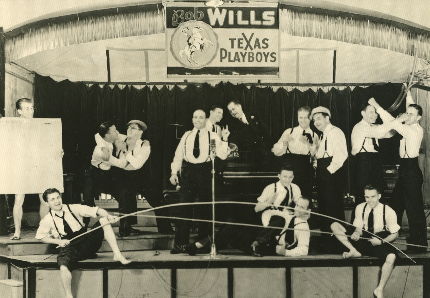 Publicity photo of Bob Wills (center) & His Texas Playboys goofing around on stage for Cam's Family Academy Radio, 1936.