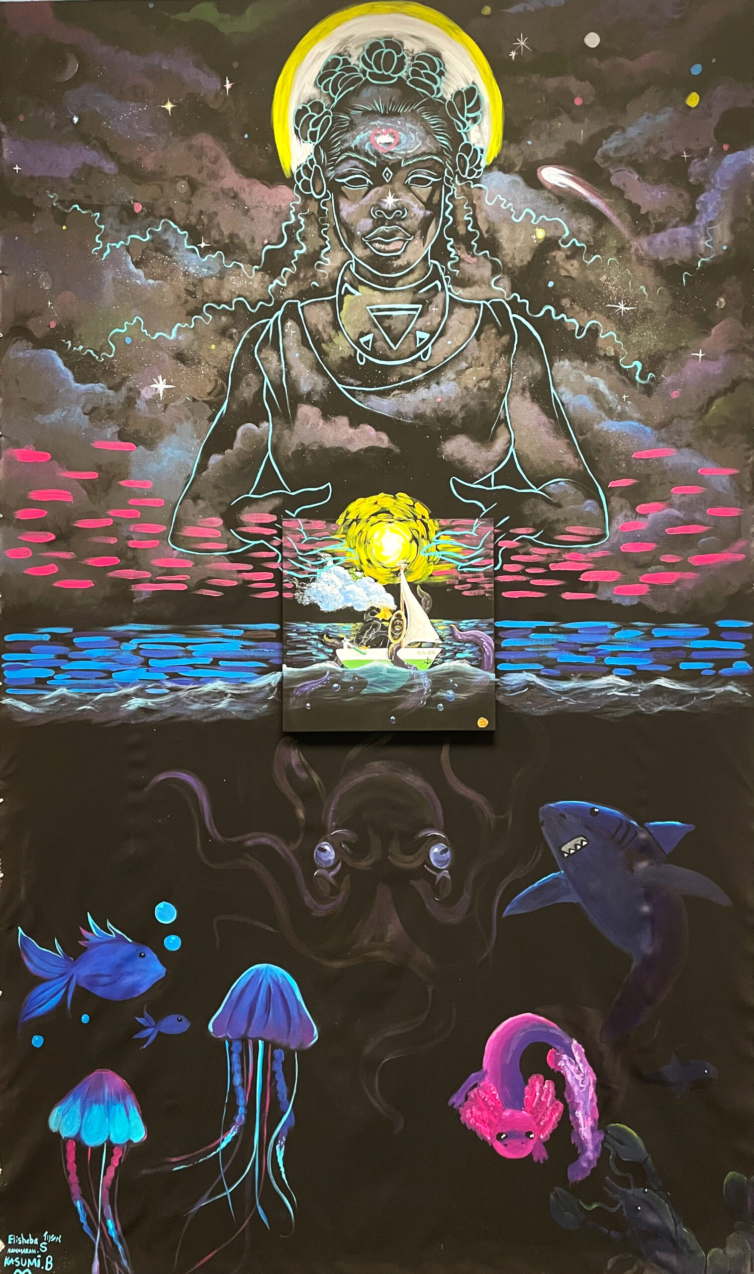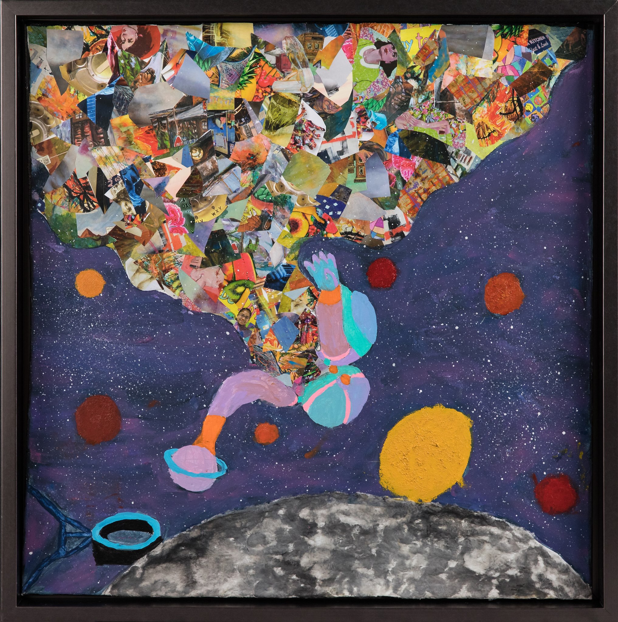 When I thought about what to create with this piece, I automatically thought about outer space instead of a blue sky. I wanted to spread a positive message and usually when you see positive things, they are colorful and full of personality and that is what I wanted my artwork to be for other people.