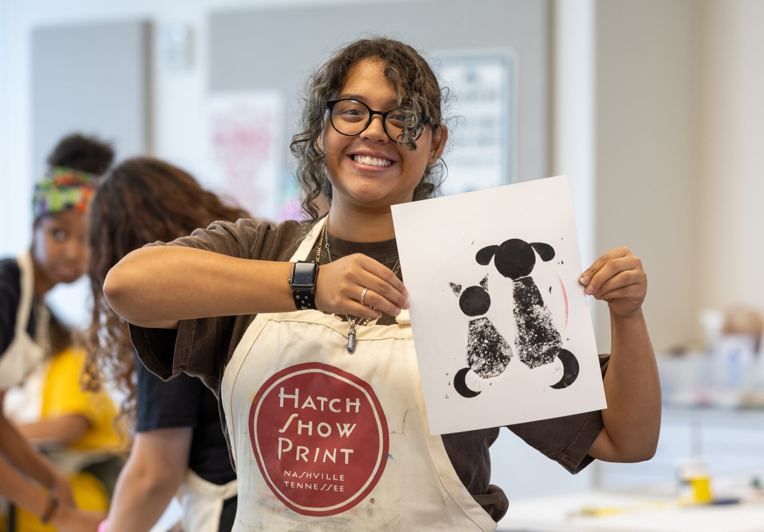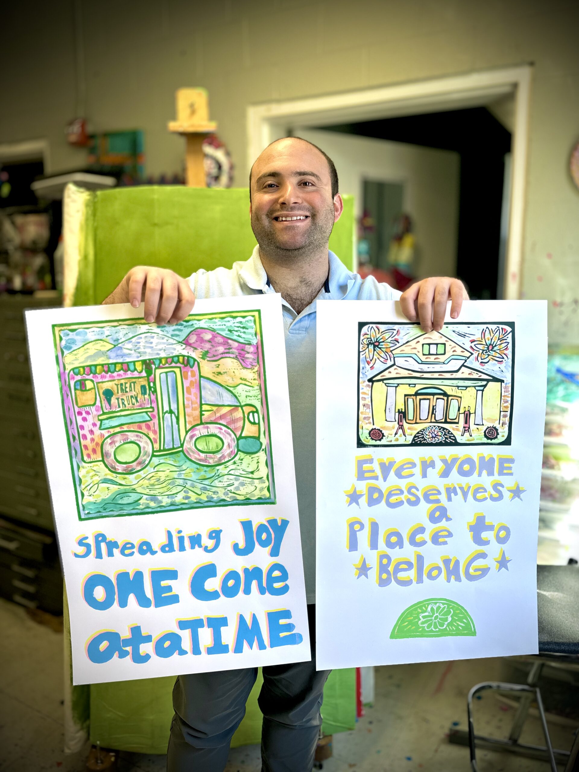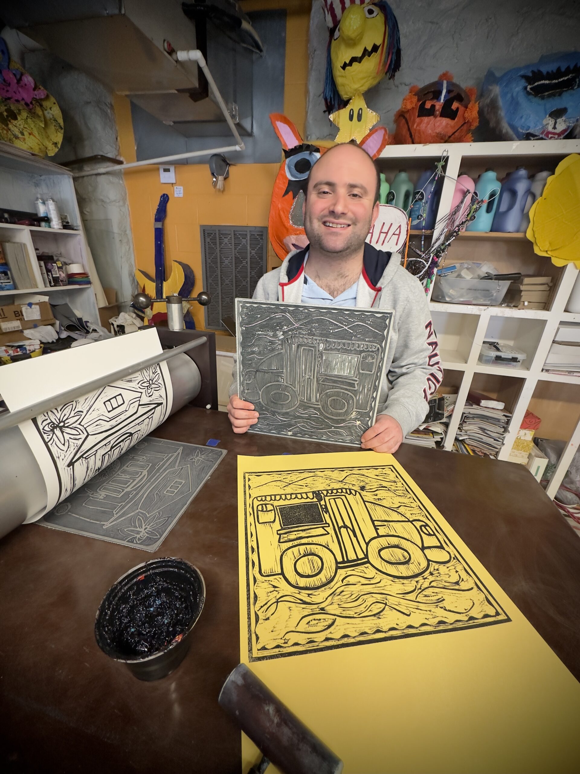 Located in Nashville, Friends Life Community provides opportunities for adults with developmental disabilities to grow personally, develop socially, and be active members of the community. Friends Life Community invited Hatch Show Print Master Printer Emeritus Jim Sherraden to be a Teaching Artist in Residence in 2023, and in late 2024, Friends Life Community artists gathered at Hatch Show Print for a “behind the presses” tour of the print shop. Jennifer Haston, visual arts program coordinator, and Sherraden assisted poster-making Friends Life Community artists Grant, Meghan, and Sam to colorfully bring their words, lettering, and images to life in the posters, as featured in Connection.