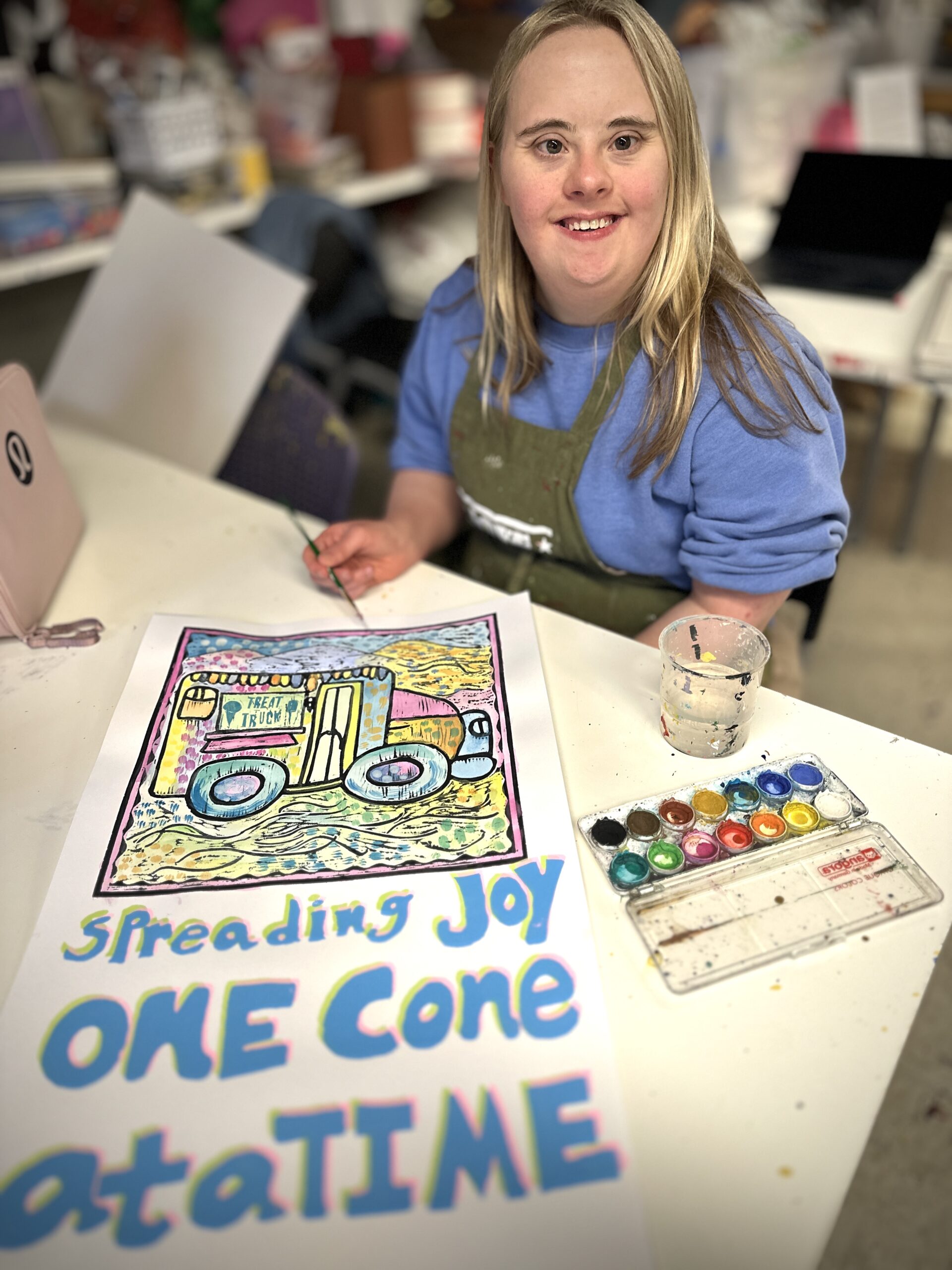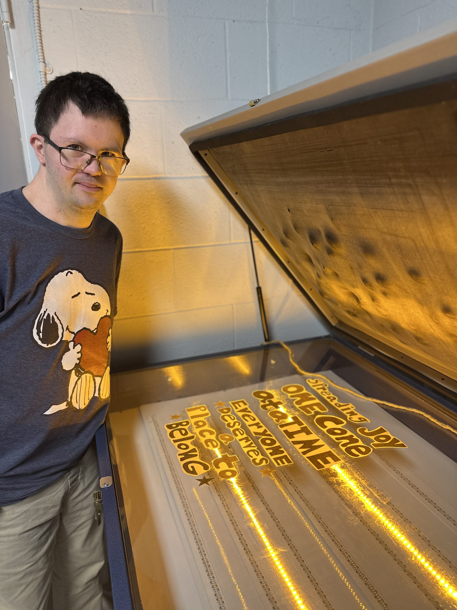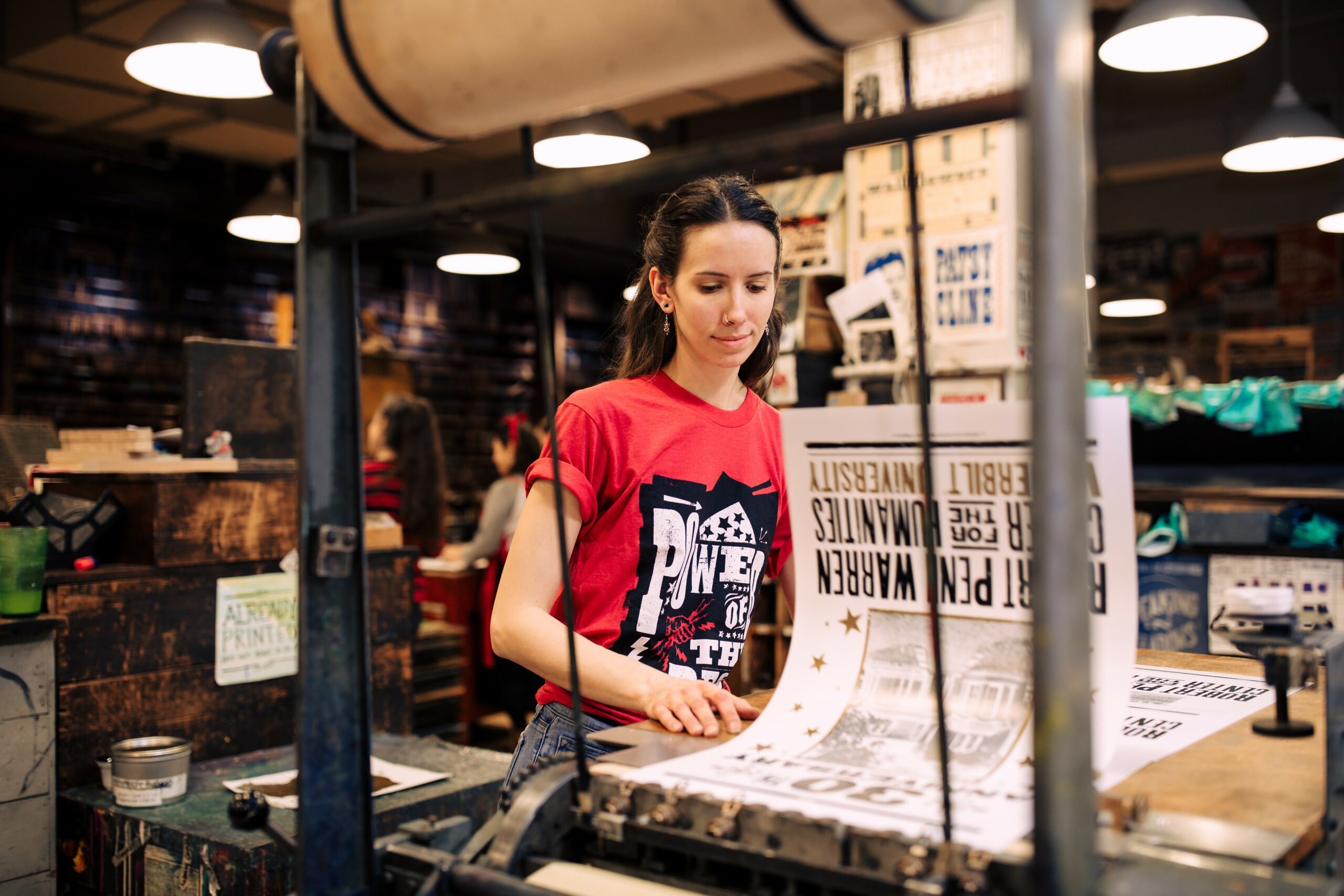 Located in Nashville, Friends Life Community provides opportunities for adults with developmental disabilities to grow personally, develop socially, and be active members of the community. Friends Life Community invited Hatch Show Print Master Printer Emeritus Jim Sherraden to be a Teaching Artist in Residence in 2023, and in late 2024, Friends Life Community artists gathered at Hatch Show Print for a “behind the presses” tour of the print shop. Jennifer Haston, visual arts program coordinator, and Sherraden assisted poster-making Friends Life Community artists Grant, Meghan, and Sam to colorfully bring their words, lettering, and images to life in the posters, as featured in Connection.