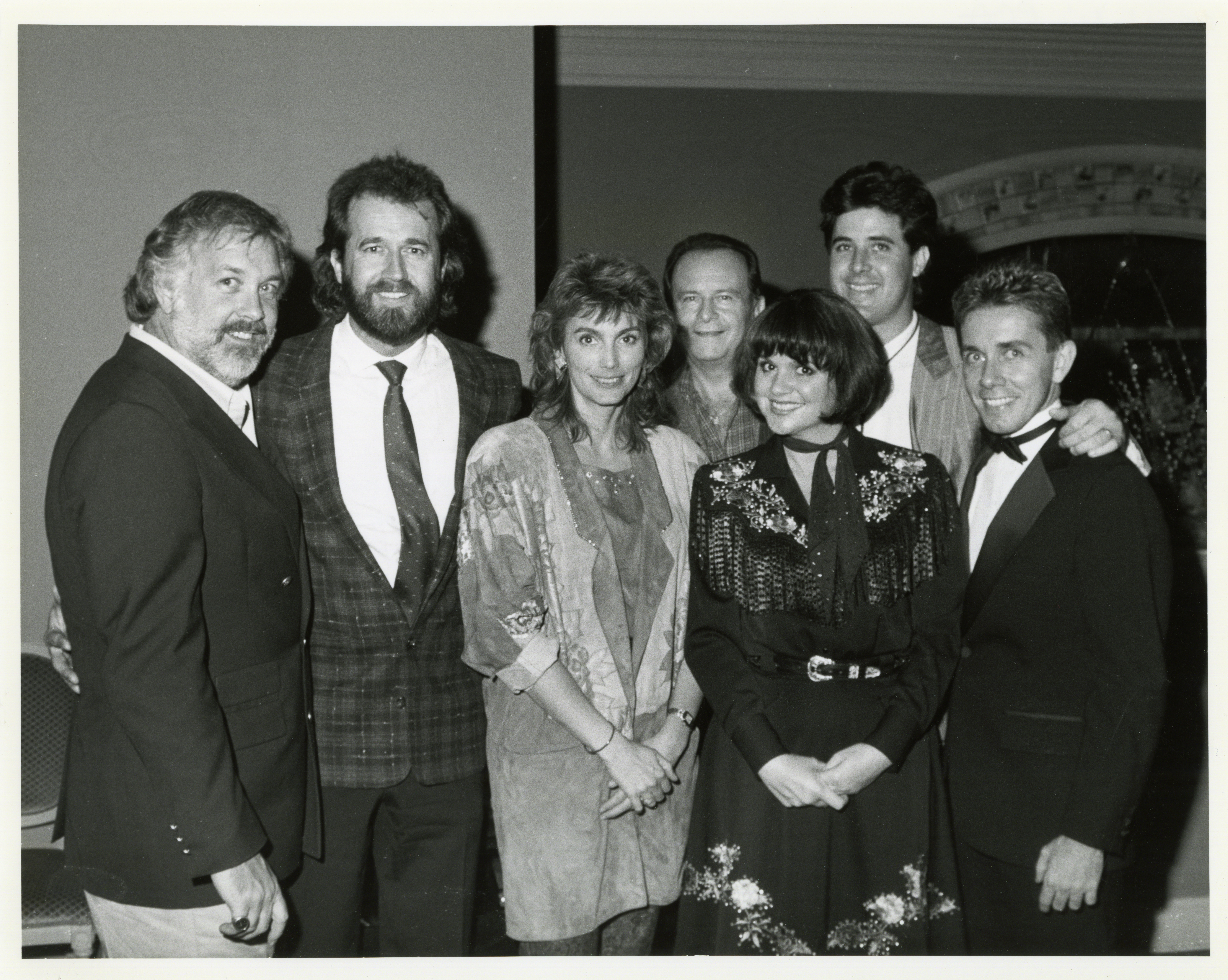 Linda Ronstadt poses with Emmylou Harris, Vince Gill, Joe Galante, and others backstage at the 1986 Country Music Association Awards.
