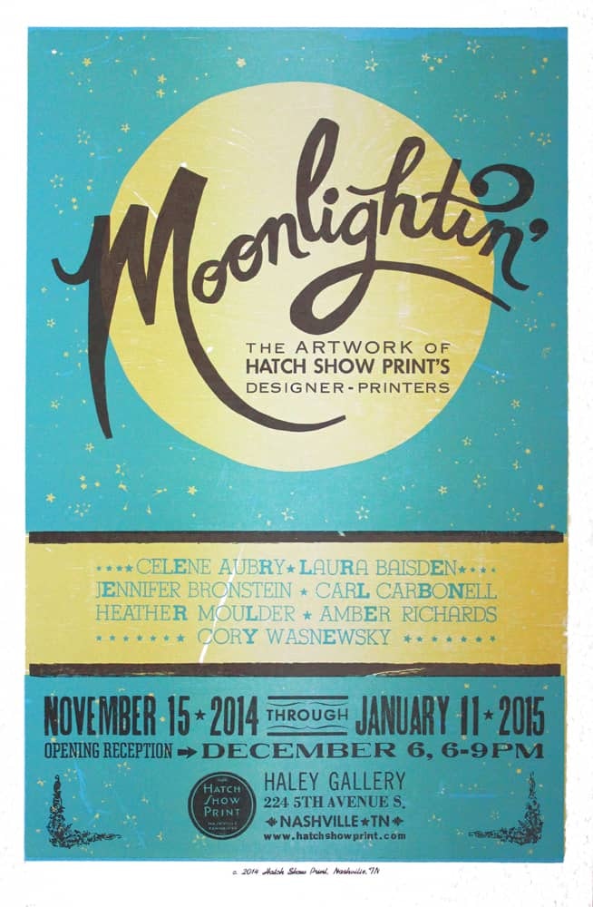 The work on display represents the experience and backgrounds of the artists, including the varied processes that fall under the general term of printmaking, plus illustration, photography and book arts. By day, they turn out the hundreds of show posters Hatch Show Print is called upon to design and produce each year. By night, their creative skills are put to work in personal endeavors. The designer-printers have studied graphic design, printmaking and/or book arts, served internships at Hatch Show Print, and collectively designed and printed thousands of poster jobs for the shop, applying their 21st century training and sensibilities to the 136-year-old archive of type and imagery. This show offers the artists an opportunity to share the work they pursue after hours, and that is inspired or influenced in some way by their daily work in the shop. #HSPMoonlightin