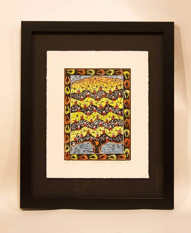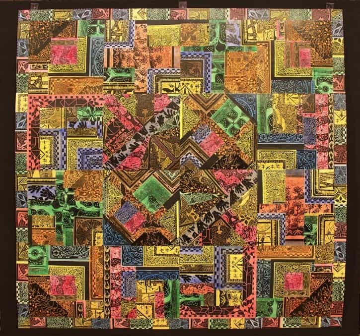 In 1992, Sherraden began creating artwork from the shop’s collection of hand-cut blocks, designed and carved by shop co-founder Charles Hatch’s son Will T. Hatch and the shop staff. Sherraden’s contemporary creations from the historic blocks—monoprints—are collected by individuals and institutions worldwide. In 2005, Sherraden returned to carving his own woodcuts, developing a new body of work that includes the artist cutting up his printed pieces and mixing and matching the patchwork imagery, resulting in quilt-like compositions.