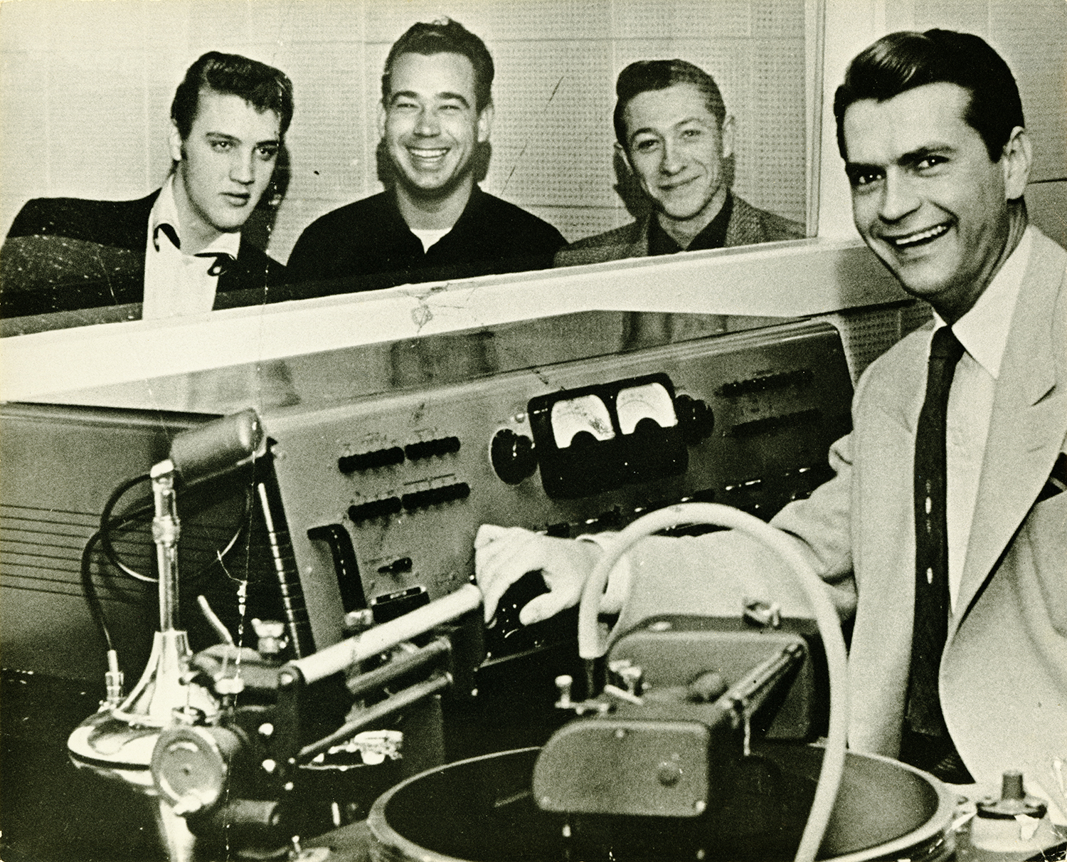 From left: Elvis Presley, Bill Black, Scotty Moore, and Sam Phillips, 1950s.
