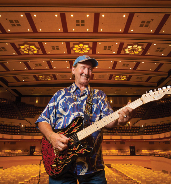 James Burton standing on stage at Shreveport Municipal Auditorium, where he began performing on the Louisiana Hayride in the 1950s. -