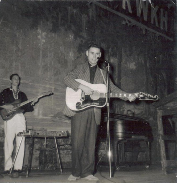 James Burton, left, backs up George Jones on the Louisiana Hayride, 1950s. -