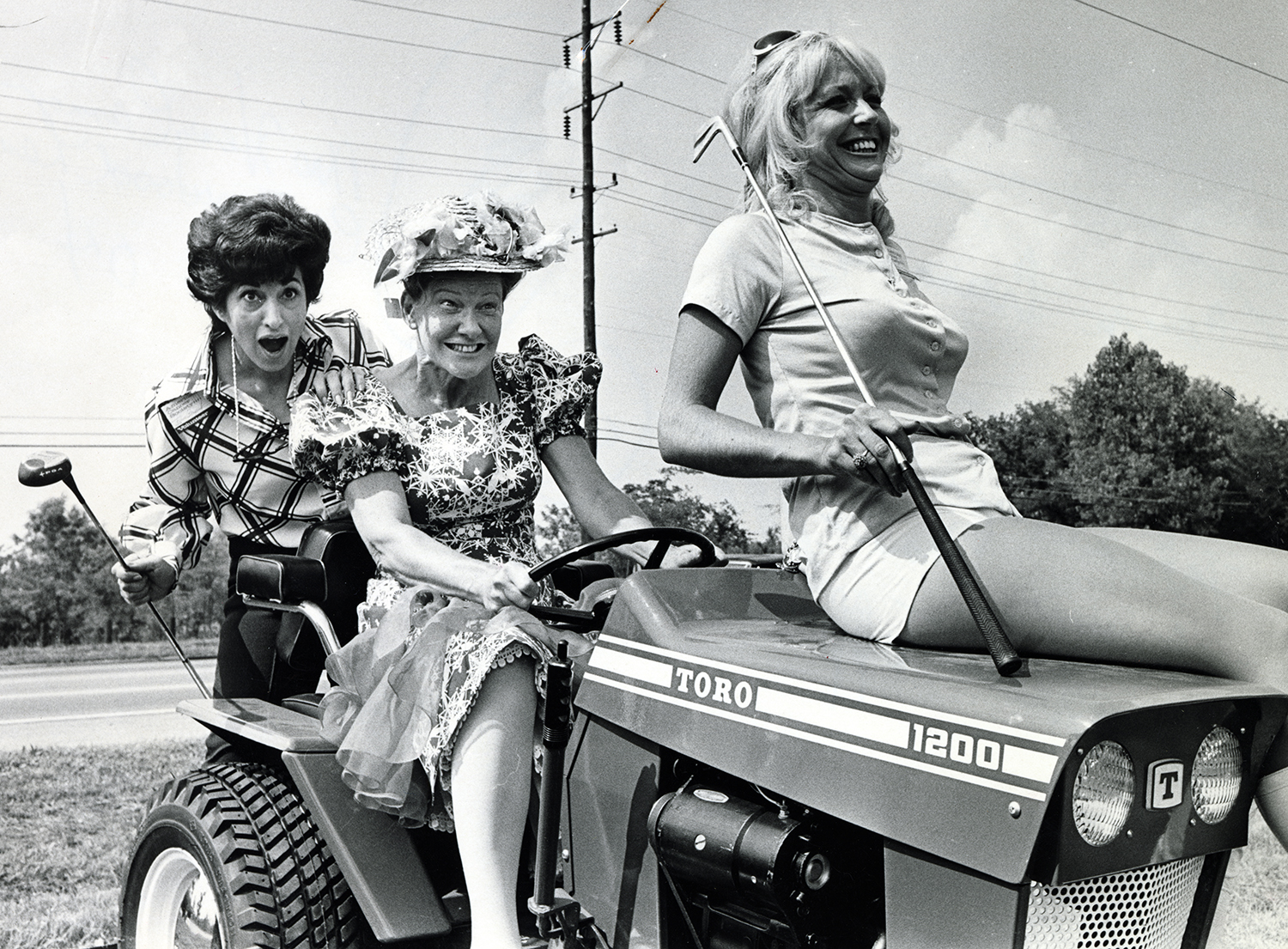 From left: Felice Bryant, Minnie Pearl, and Demetriss Tapp riding a Toro tractor and holding golf clubs during an event called the “Cancer Crusade.” Photo by Joe Rudis of the Tennessean.