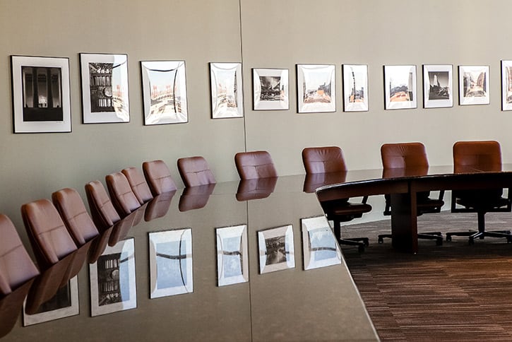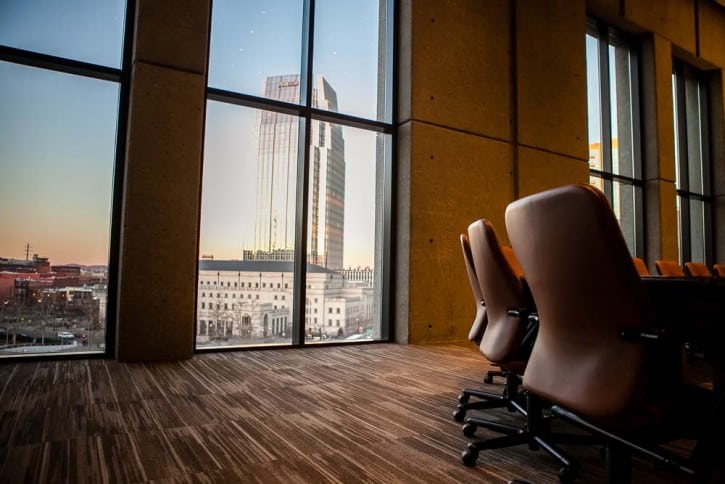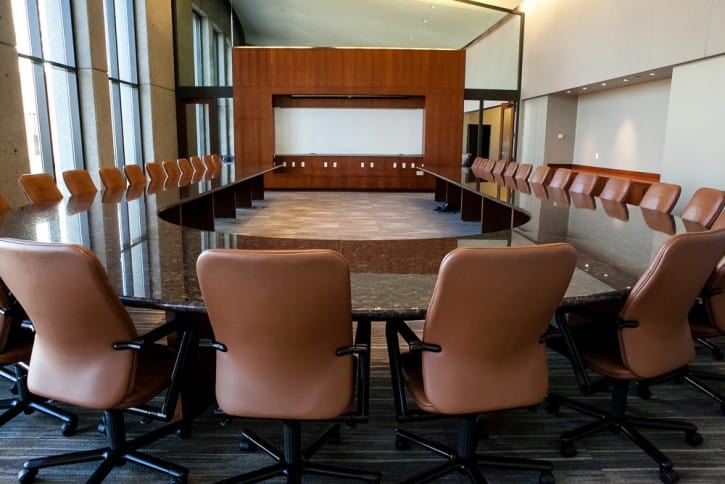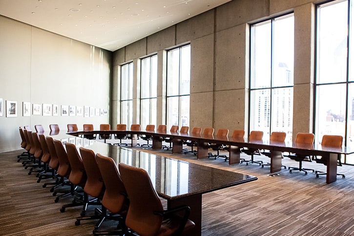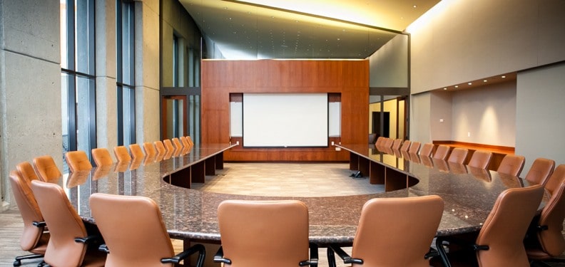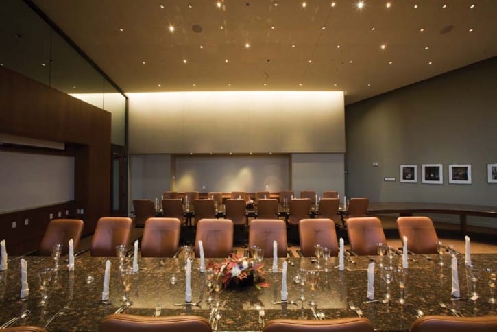 The Bud Wendell & Steve Turner Boardroom features a 65-foot granite, u-shape table with 41 executive leather chairs, and exhilarating views of the city skyline, day or night. Our production team can assist with standard presentations, live streaming, and recording for your meetings in our unique space.