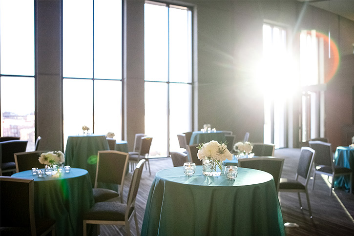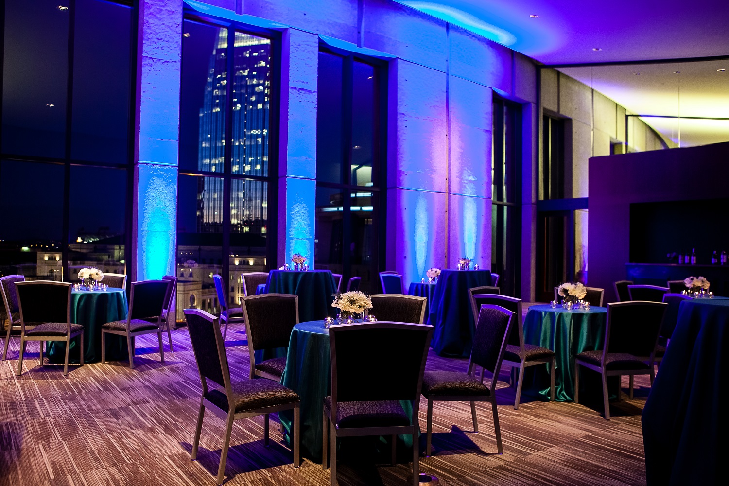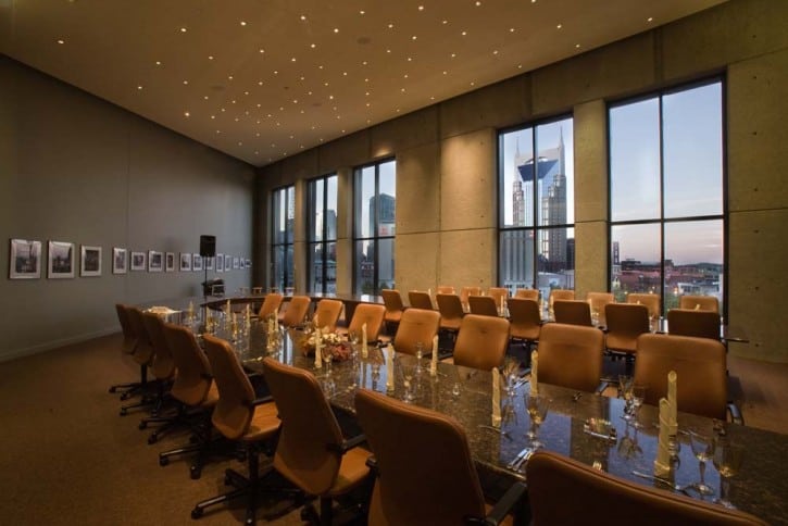 The warmth of cherry wood panels envelops the BMI Hall and the stately Bud Wendell & Steve Turner Boardroom on our fourth floor. Floor-to-ceiling windows reference piano keys, part of the building’s musically themed design, with views overlooking the Music City Walk of Fame Park and downtown Nashville, making it a choice venue for corporate event planners. By day, natural light lends a warm glow to this unique event space. By night, the view of the city is even more dramatic.